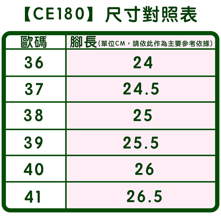 ●選擇鞋碼尺寸時,盡量以腳長尺寸作為參考依據,再依照是否寬腳或是特殊腳形,斟酌選擇大一碼或小一碼